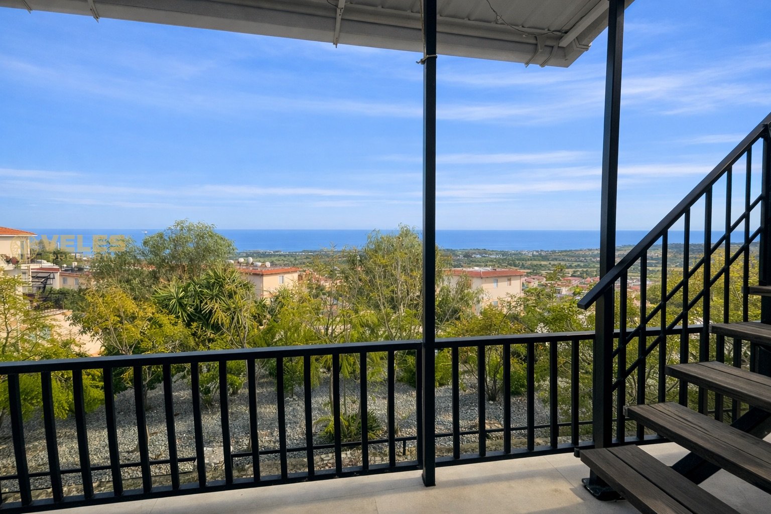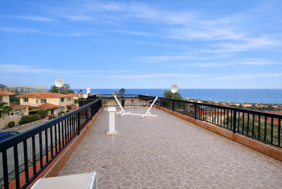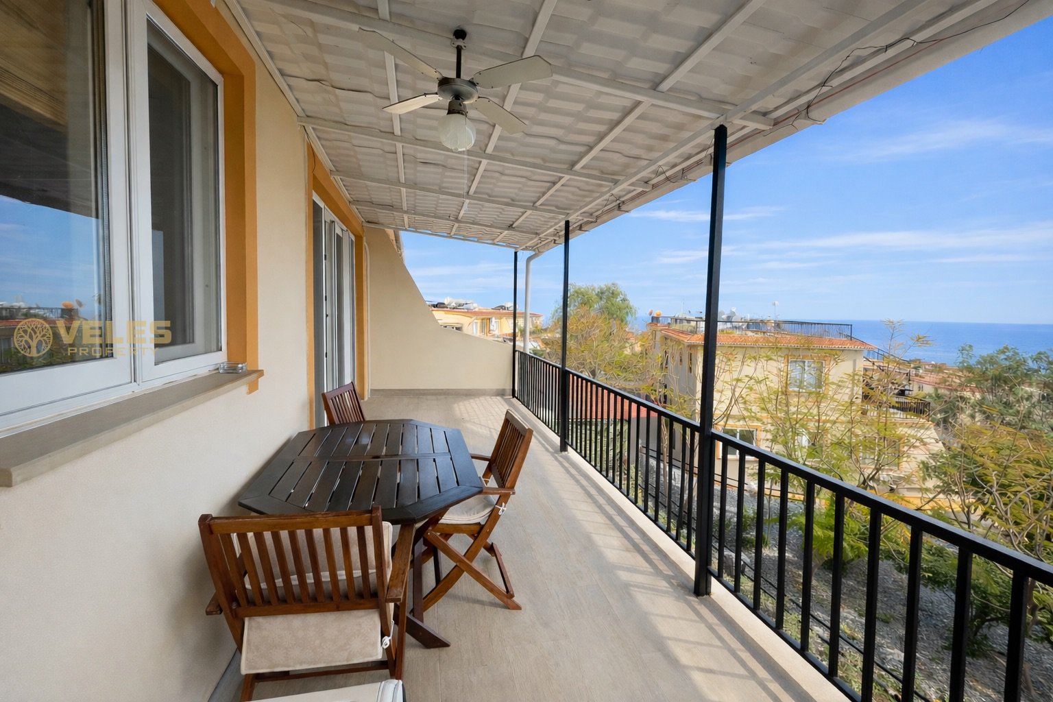 A cozy apartment with a roof terrace is located in a gated residential complex with a barrier. The windows and terrace offer a picturesque view of the Mediterranean Sea and the mountains, creating an atmosphere of comfort and tranquility.