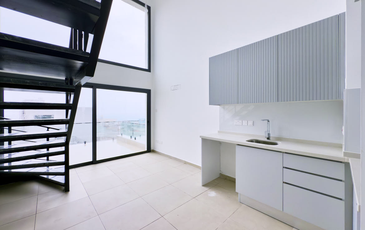 Two-bedroom apartment with stunning direct sea views. The apartments are built in the style of a two-storey loft. On the ground floor there is a living room, a kitchen and a bedroom with a bathroom. And on the upper floor there is one bedroom with panoramic windows. Such windows saturate the entire room with light and warmth.